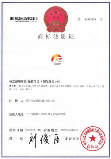 朝陽市金麟鐵精粉有限公司“企業徽標”商標注冊成功,是公司品牌建設的重要里程碑,這標志著我公司開始走上品牌發展之路,真正建立起了走向市場的“名片”,也是公司信譽和質量的象征,將促進我們不斷提升服務水平和商品質量,公司一直以“開拓創新,精益求精,精細管理,優質服務”的質量方針,為創造強勢品牌和公司可持續發展奠定堅實基礎。